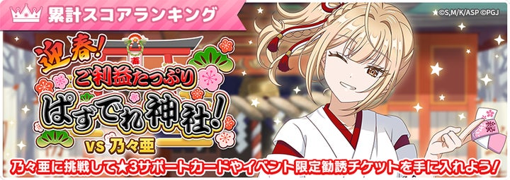 - 1月11日(日)12:00から、累計スコアランキングイベント「迎春!ご利益たっぷりぱずでれ神社!VS乃々亜」が開催。