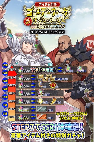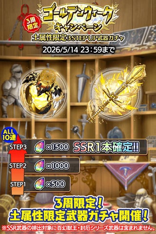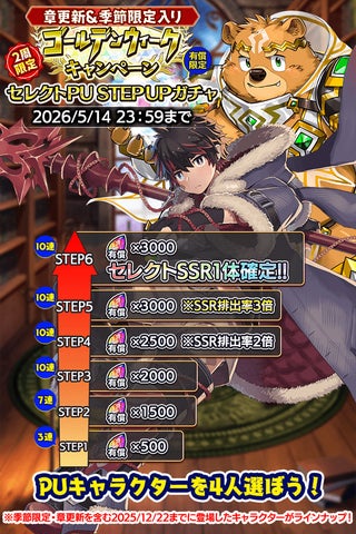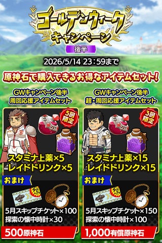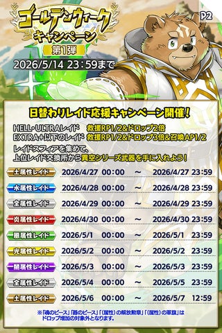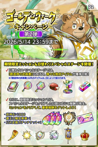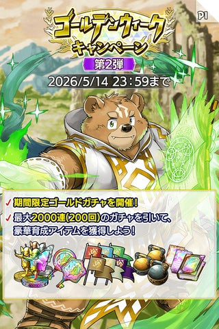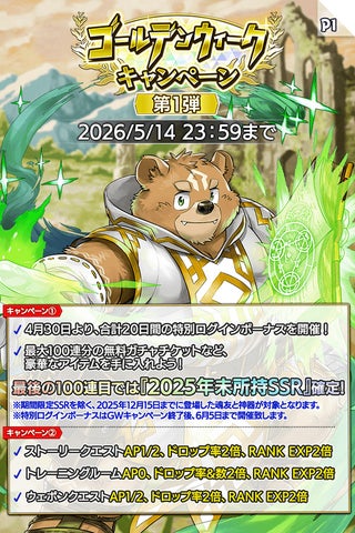 ゴールデンウィークキャンペーンも開催され、最大100連無料ガチャ、クエスト促進キャンペーン、日替わりレイド応援キャンペーンなど、豪華な内容となっている。