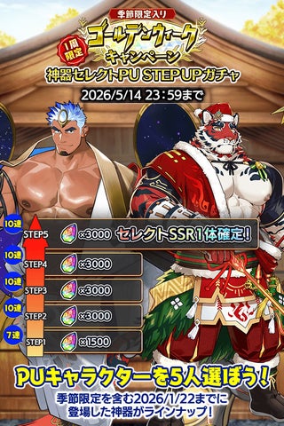 - ゴールデンウィークキャンペーンで最大100連無料ガチャや様々な特典が用意されている。