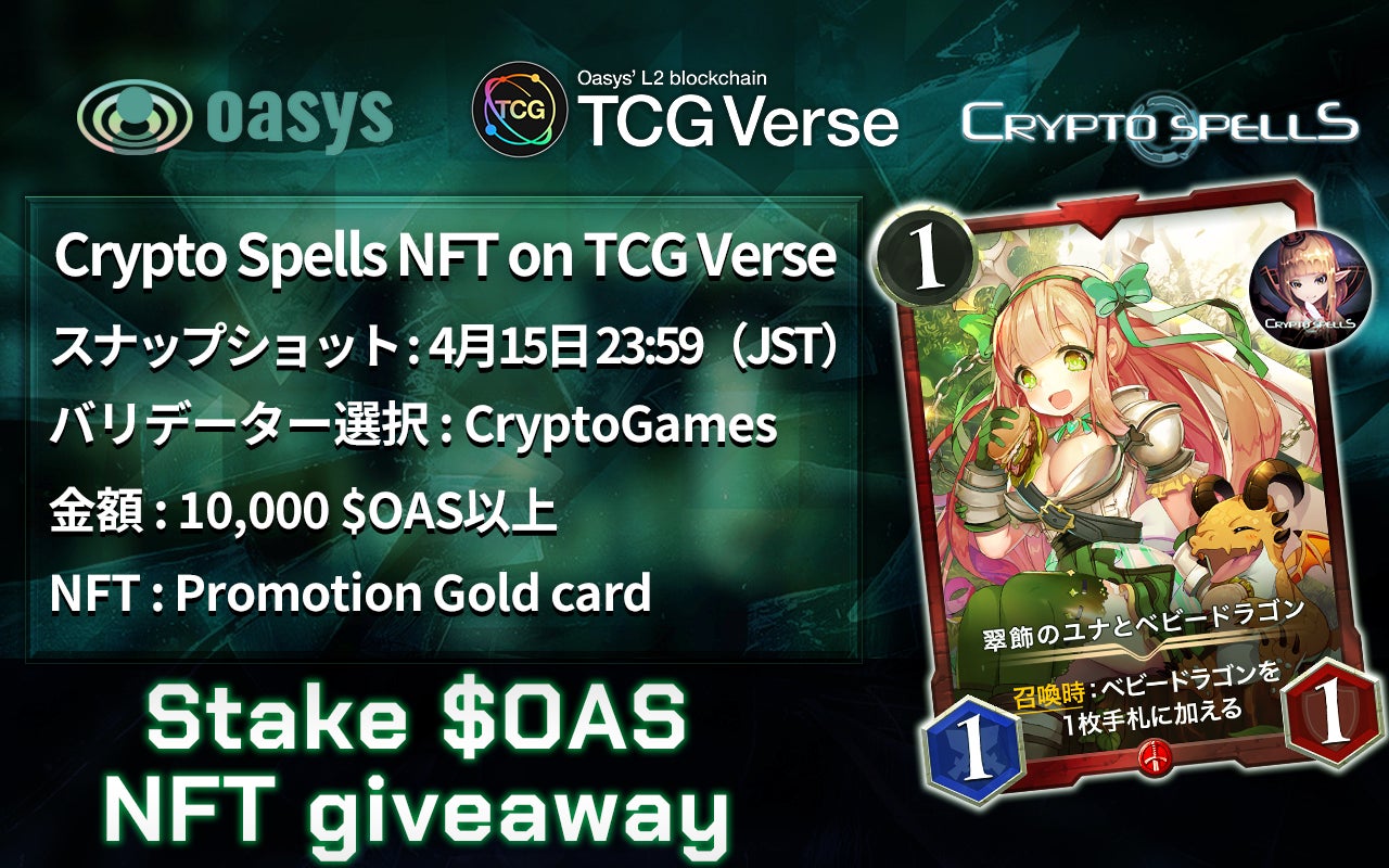 ブロックチェーンゲーム「CryptoSpells」を運営するCryptoGames株式会社(東京都渋谷区、代表取締役:小澤 孝太)は、ゲーム特化型ブロックチェーンOasysでのステーキングキャンペーンを開始することをお知らせいたします。