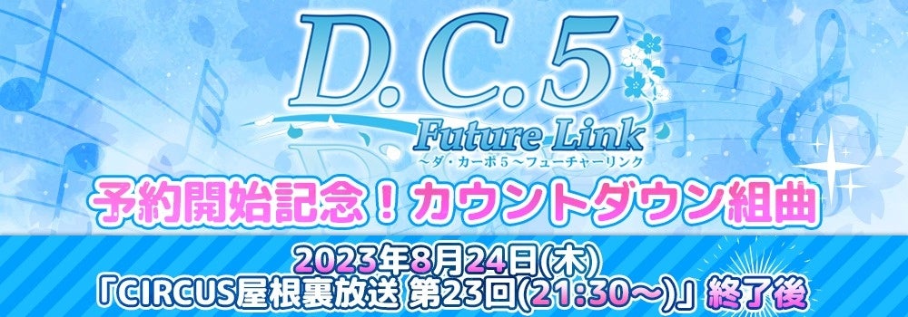 DMM GAMESは、CIRCUSが開発したパッケージゲーム「D.C.5 Future Link ~ダ・カーポ5~ フューチャーリンク」の予約開始を記念して、カウントダウン組曲を開催します。