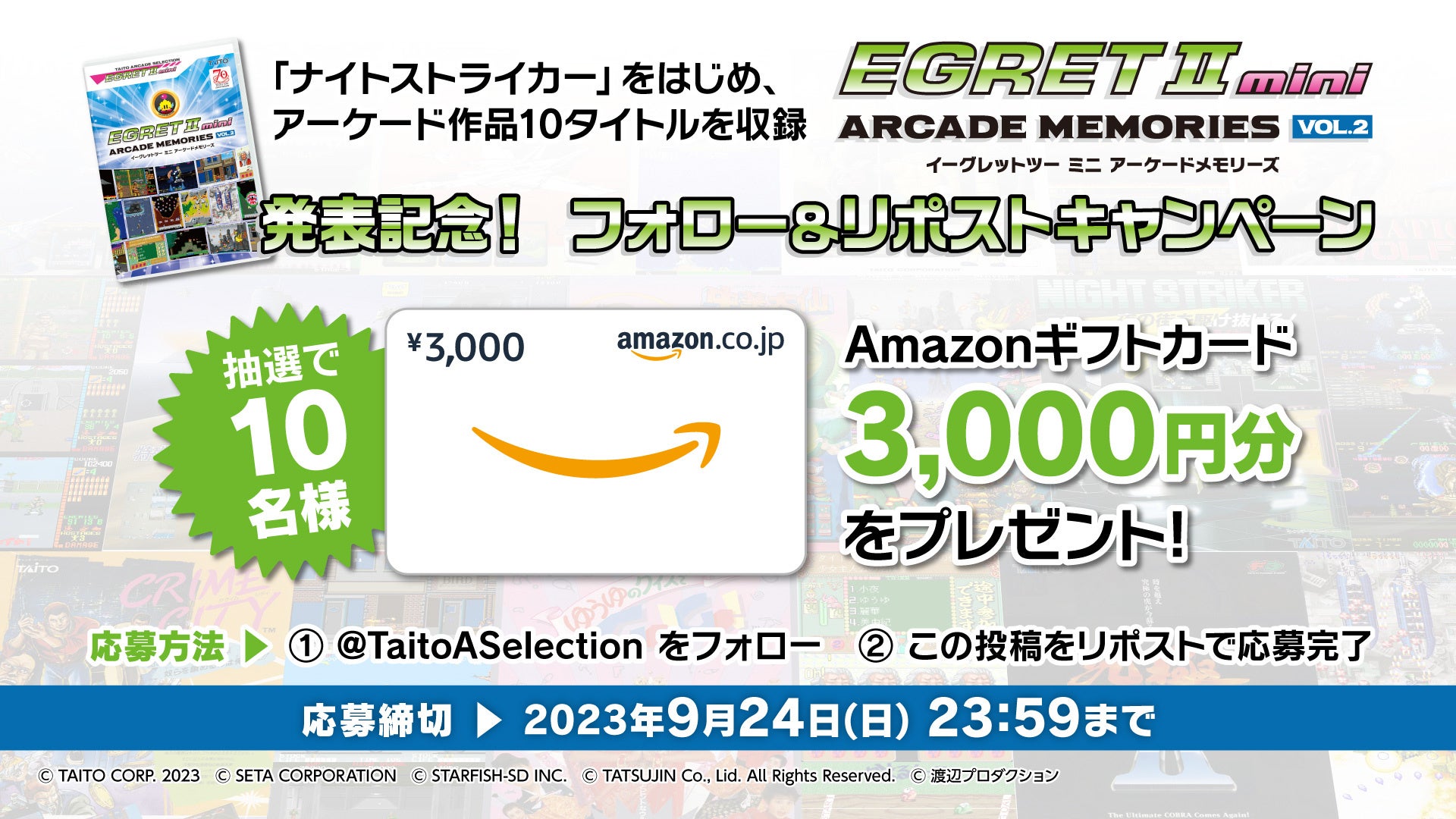 株式会社タイトーは、2023年12月21日に発売する『イーグレットツー ミニ』専用ソフト収録SDカード『アーケードメモリーズVOL.2』の購入受付を開始しました。