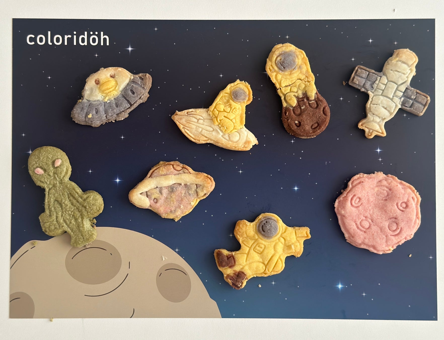 キットには、通常のcoloridohクッキー生地6色セットに加え、宇宙をテーマにしたプレイシートリーフレットとクッキー型(8個入り)が含まれています。