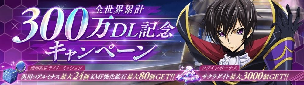 「コードギアス 反逆のルルーシュ ロストストーリーズ」の全世界累計ダウンロード数が300万を突破しました!これを記念して、「全世界累計 300万DL記念キャンペーン」が開催されます。