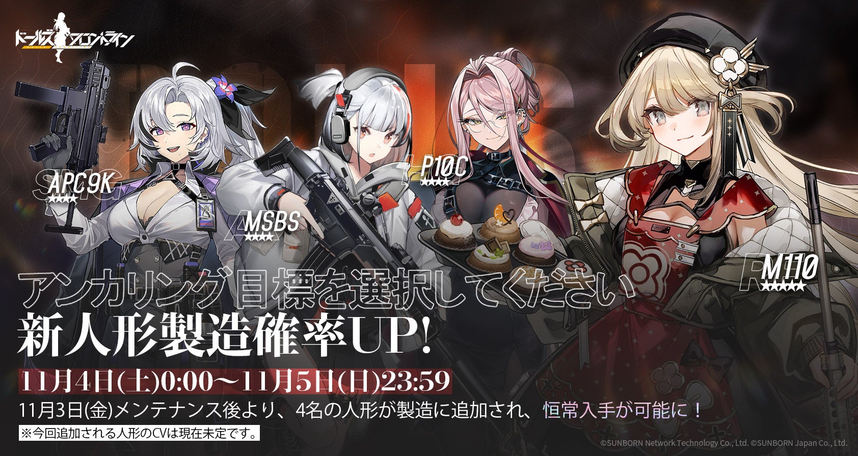 株式会社サンボーンジャパンは、スマホ向けの戦略型シミュレーションゲーム『ドールズフロントライン』において、11月3日に新たな4体の人形を追加し、それに伴う確率UPイベントを開催することを発表しました。