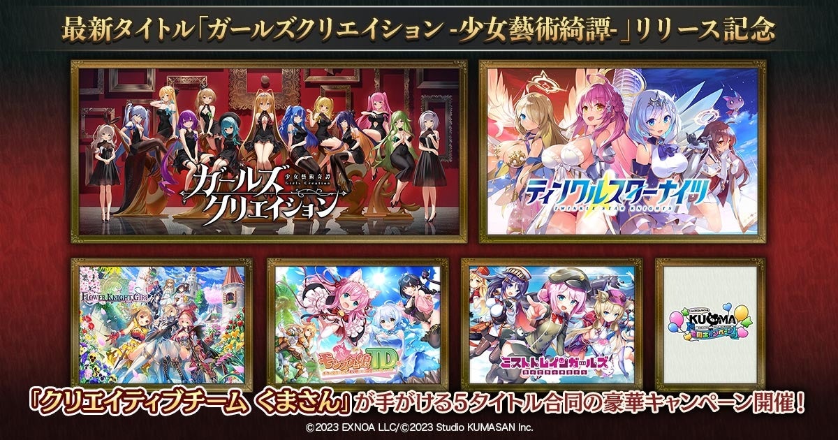 - ガールズクリエイション -少女藝術綺譚-、ティンクルスターナイツ、モンスター娘TD~ボクは絶海の孤島でモン娘たちに溺愛されて困っています~、ミストトレインガールズ~霧の世界の車窓から~、FLOWER KNIGHT GIRL