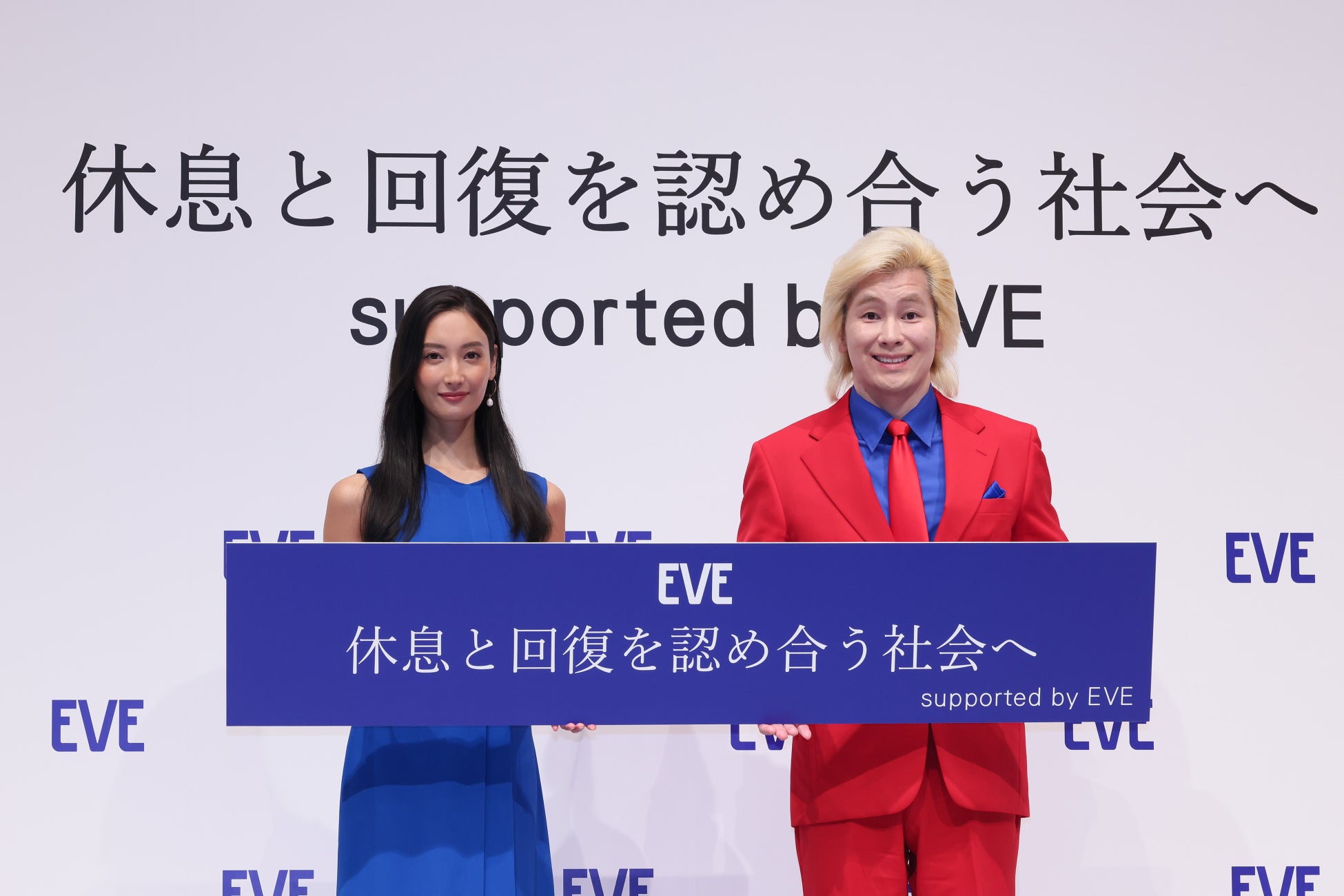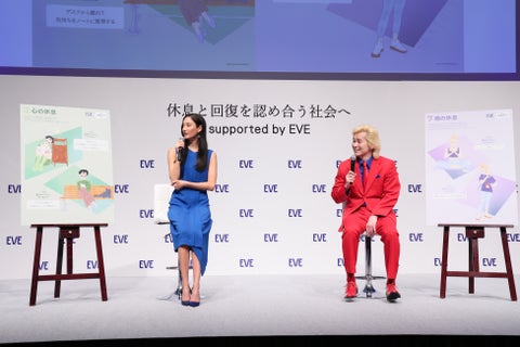 EVE(イブ)アンバサダーの菜々緒さんとカズレーザーさんがゲストとして登壇し、休息と回復に関するプログラムが行われました。
