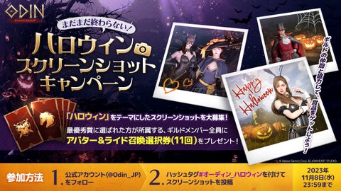 ハロウィンスクリーンショットキャンペーンでは、ハロウィンをテーマにしたスクリーンショットを投稿すると、最優秀賞に選ばれた方が所属するギルドのメンバー全員に「アバター&ライド召喚選択券(11回)」がプレゼントされます。