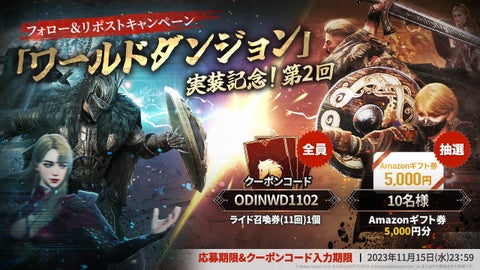 また、ワールドダンジョン実装記念フォロー&リポストキャンペーンでは、キャンペーンポストをリポストした方の中から抽選で10名にAmazonギフト券5,000円分がプレゼントされます。