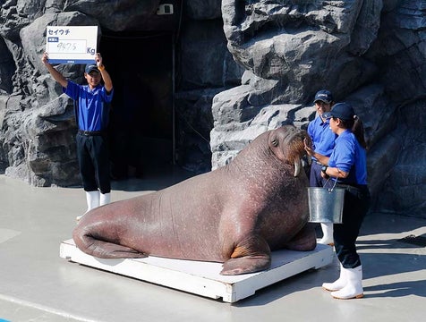 特製の体重計を使用して、バンドウイルカのオリノやセイウチのリクなどの大型海獣類の体重を計測しました。