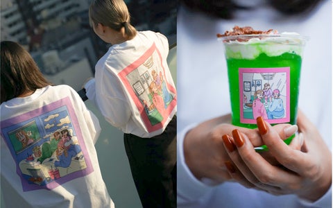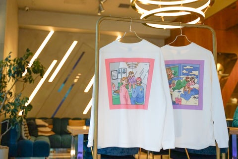プロジェクター付きの客室やホテル内のレストランで過ごすシーンをイメージした2種類のコラボアートを使用し、オリジナルTシャツやステッカーを販売しています。