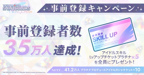 - 事前登録者数は35万人を突破し、35万人達成を記念してアイドルスキルLvアップチケットプラチナ ×5がプレゼントされる