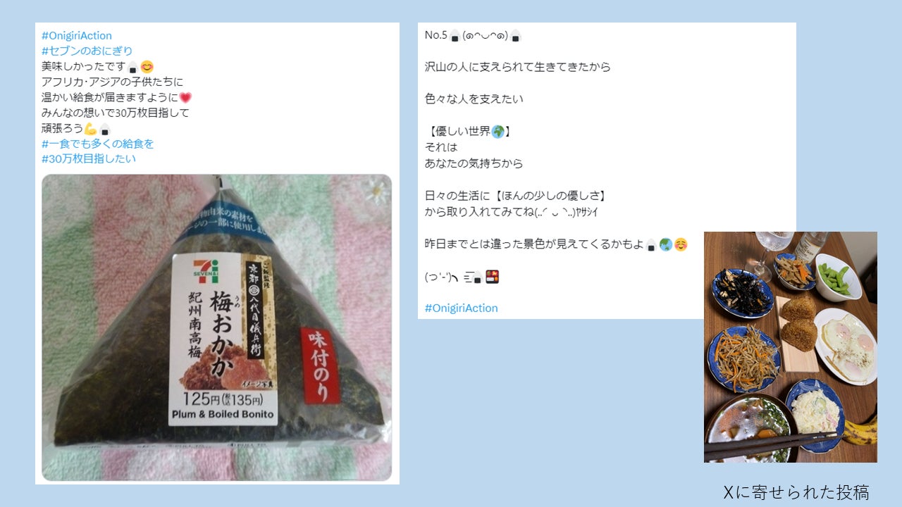 - 参加者はおにぎりの写真を投稿し、協賛企業が寄付を行い、アフリカアジアの子どもたちに給食を届ける