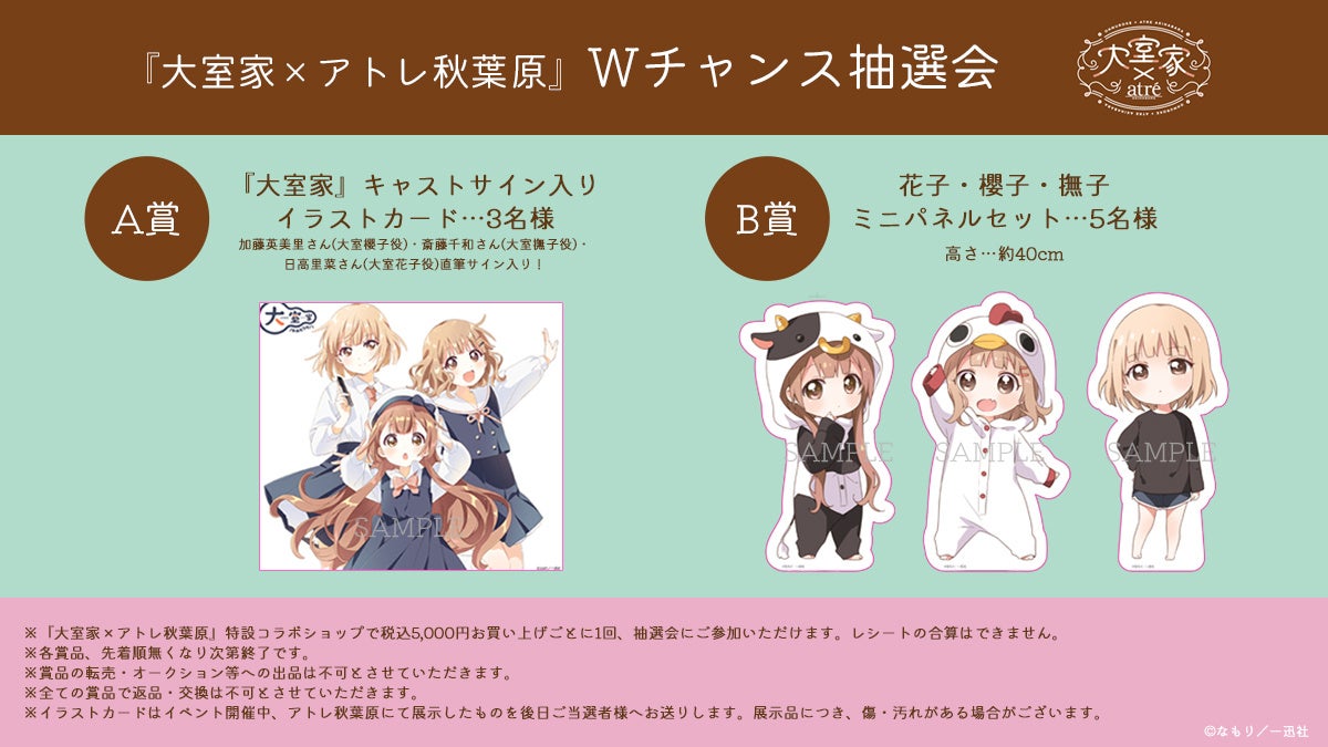 コラボ開催期間中、アトレ秋葉原の対象ショップでお会計税込み500円毎に『大室家』のオリジナルカードがプレゼントされます。