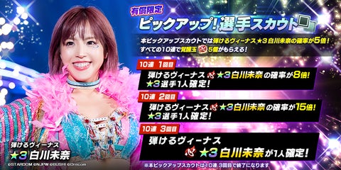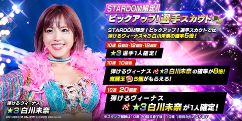 新日SSでは、2023年11月22日(水)のメンテナンス終了後から、スターダムより新規育成選手として、★3「[弾けるヴィーナス]白川未奈」が登場します。