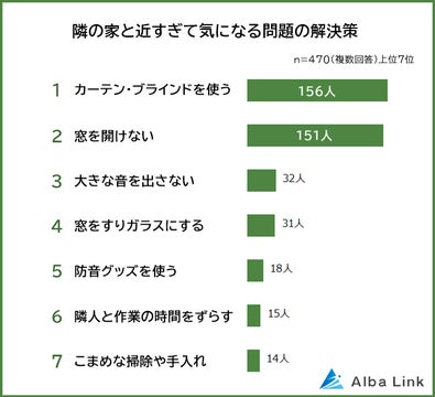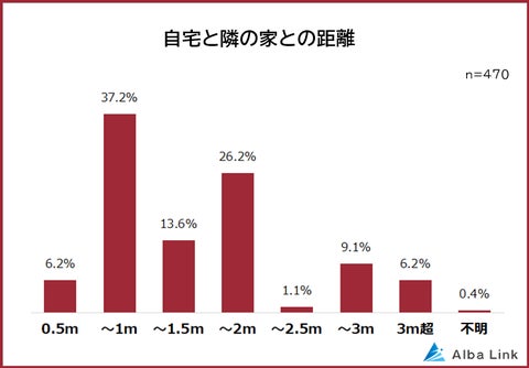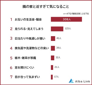 株式会社AlbaLinkが実施したアンケート調査によると、隣家との距離が近い戸建住宅にお住まいの470人のうち、最も多かった問題は「お互いの生活音・騒音」でした。