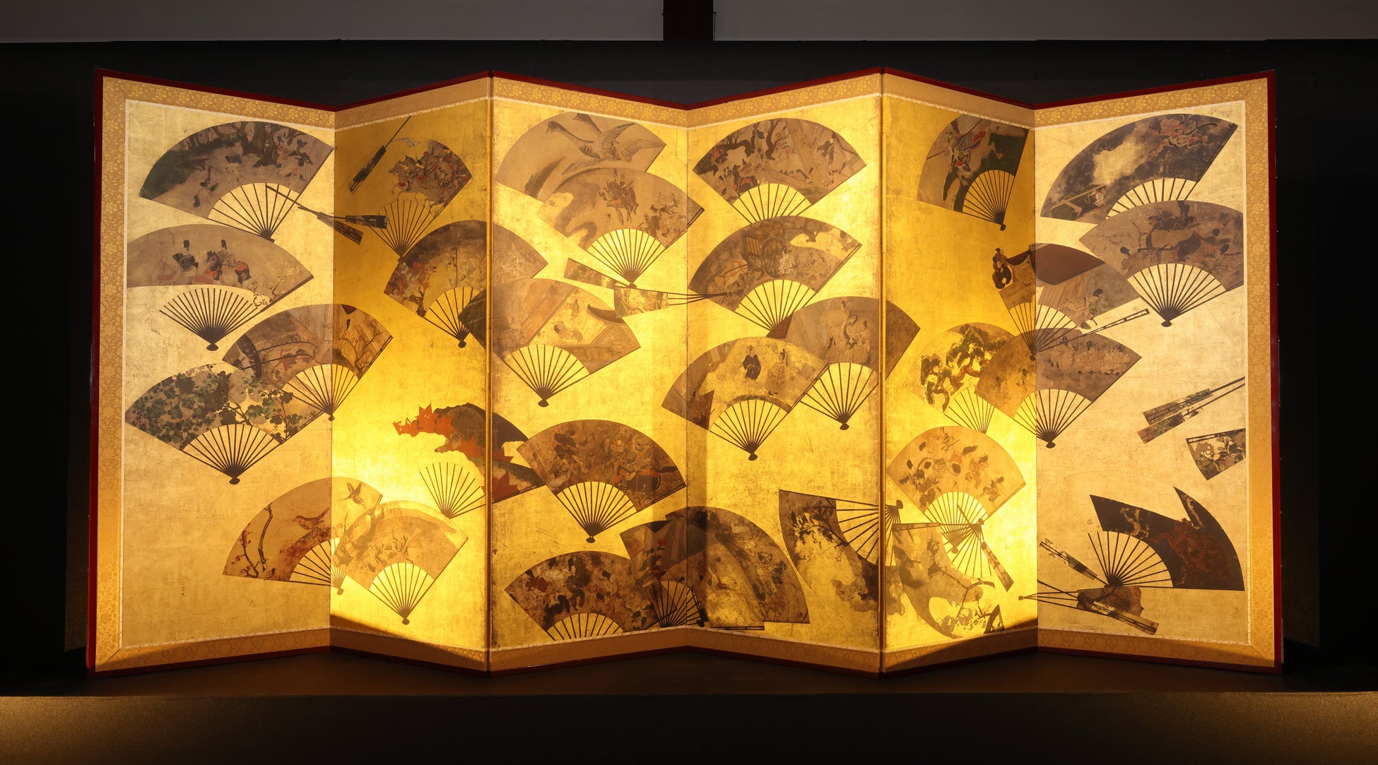 この作品は、金屏風に多数の扇子の絵が貼り付けられており、オリジナルはスミソニアン国立アジア美術館に所蔵されており、非公開とされています。