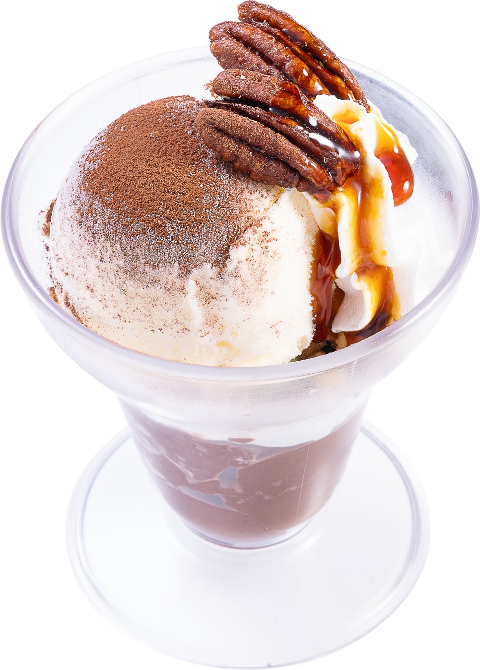 キャンディングペカンナッツとカラメルソース、ココアパウダーがトッピングされています。