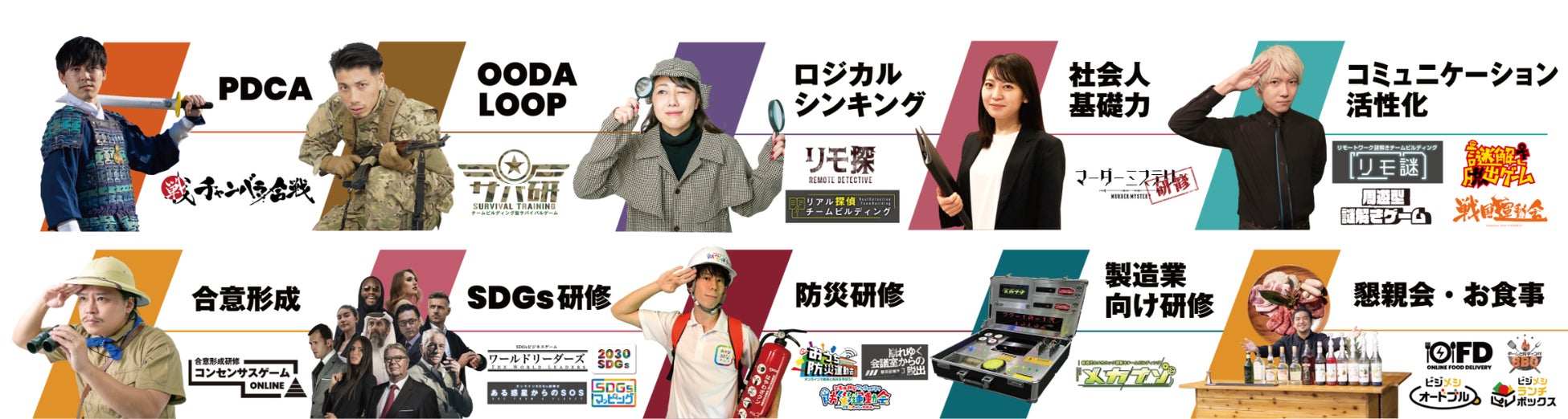 - チームビルディング、チャンバラ合戦、謎解き脱出ゲーム、コンセンサスゲーム、防災運動会、ワールドリーダーズ、LINE謎解き、商談