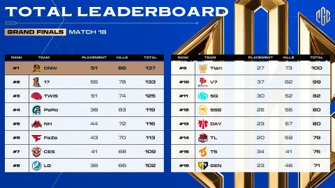 韓国のDANAWA E-SPORTSが137ポイントを獲得し、優勝しました。