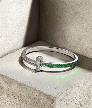 T ワン ブレスレットは、105個のダイヤモンドと74個のツァボライトがあしらわれた力強いデザインで、ティファニーのレガシーとアーシャムの未来的な美を結びつけています。
