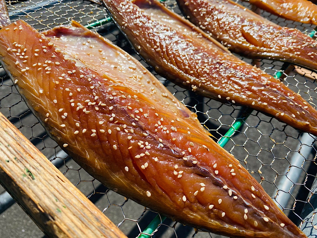 彼の干物は、日本の伝統的な発酵食品や調味料を使用し、魚の種類も定番のアジやサバだけでなく、高級魚の金目鯛やノドグロ、ビンチョウマグロや花えびなども取り扱っています。