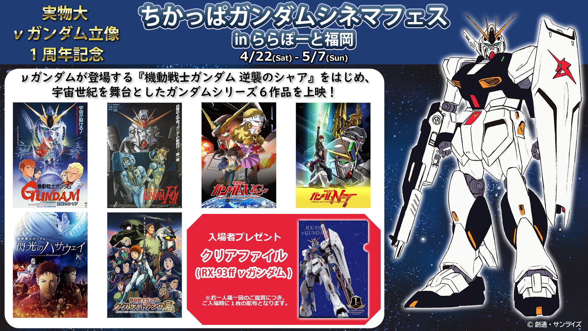 実物大νガンダム立像1周年を記念して、TOHOシネマズ ららぽーと福岡で「ちかっぱガンダムシネマフェス」の開催が決定!νガンダムが登場する『機動戦士ガンダム 逆襲のシャア』をはじめ、宇宙世紀を舞台としたガンダムシリーズを上映します。