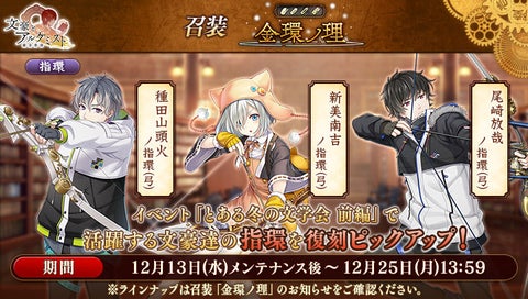 さらに、限定召装『とある冬の文学会 前編』では、「新美南吉」「尾崎放哉」「種田山頭火」の聖歌隊風衣装を編成すると、得点の獲得率が30%上昇します。