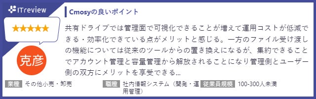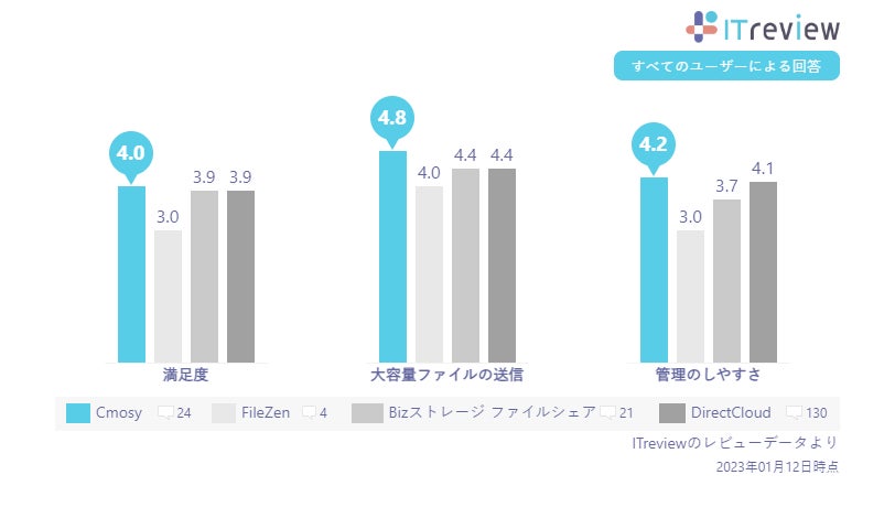 おかげさまで、Cmosy(クモシィ)は、「大容量ファイルの送受信」「管理のしやすさ」でご好評をいただいており、お客様満足度4.0(5.0点満点中)をいただいております。