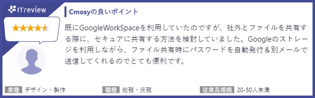 CmosyはGoogle Workspaceのセキュリティポリシーを保持した状態でファイルを安全に社外と送受信できるサービスで、お客様満足度4.0を獲得している。
