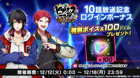 TVアニメ第2期『ヒプノシスマイク-Division Rap Battle-』Rhyme Anima +の放送記念キャンペーンも同時に開催されます。
