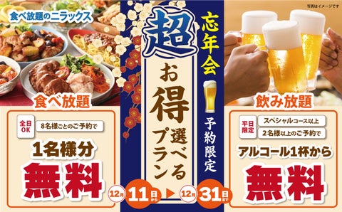 忘年会シーズンがやってきました!今年の締めくくりの忘年会は、『食べ放題』で決まりです!ニラックスブッフェでは、2023年12月31日(日)までのWEB予約限定で、超お得な『忘年会プラン』が登場しました。