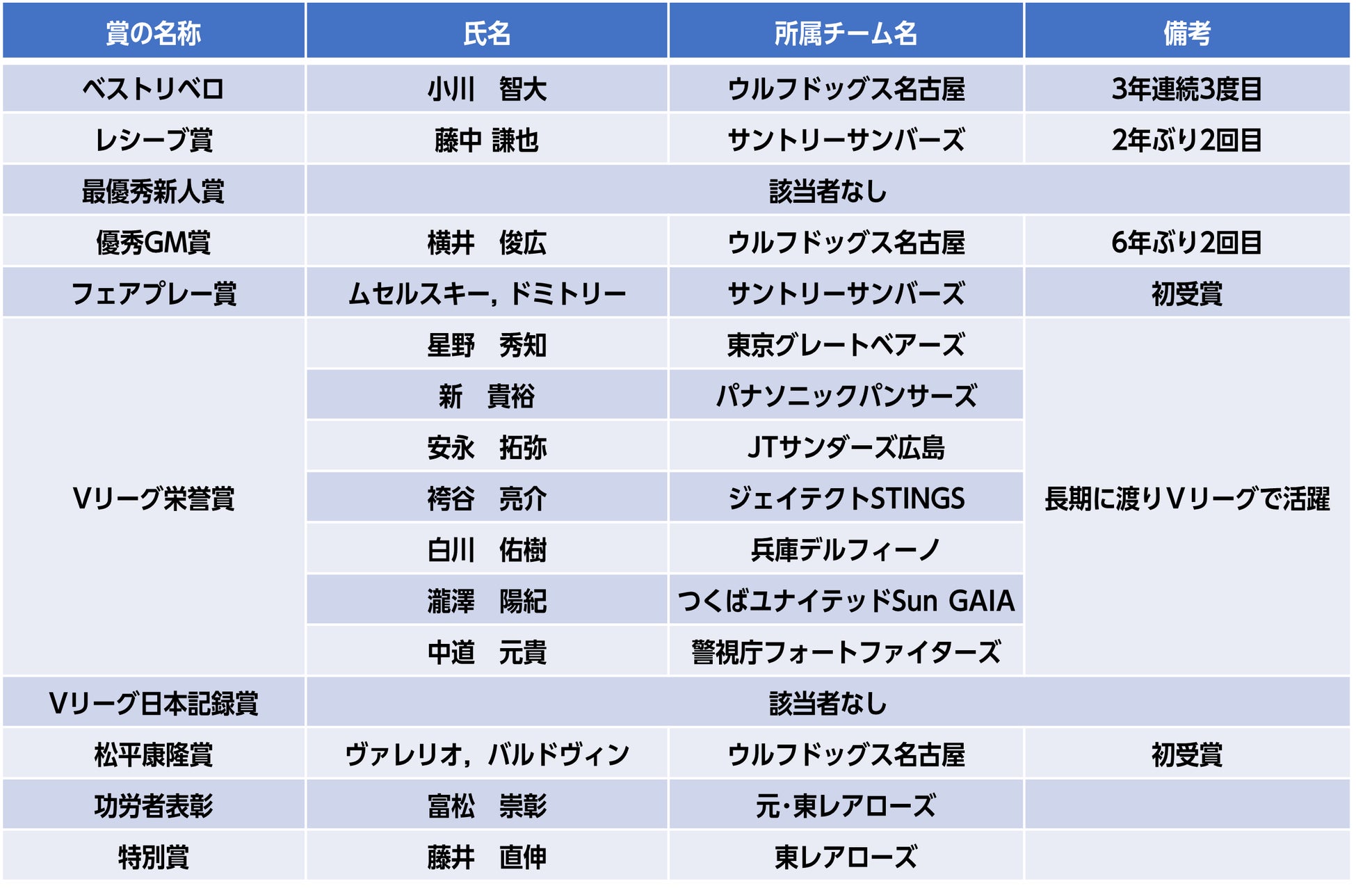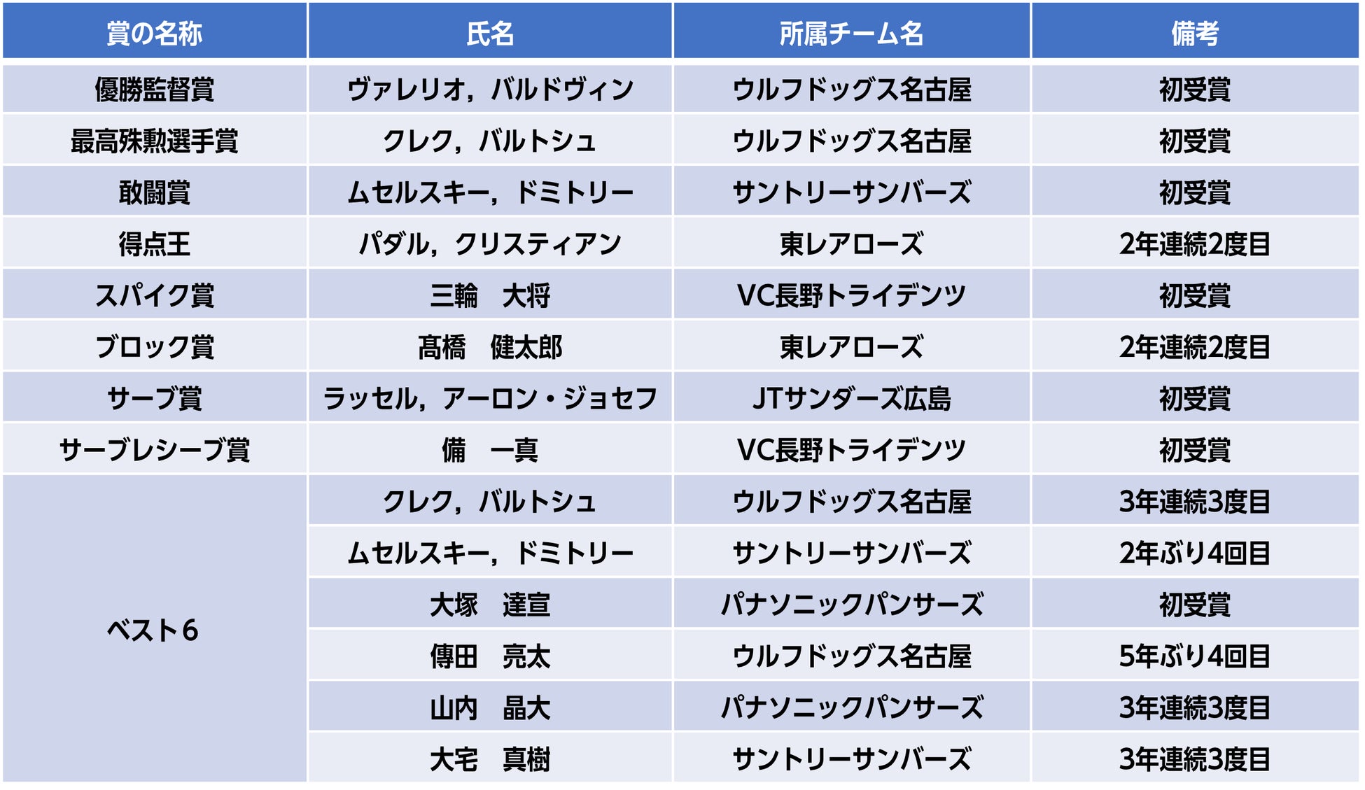 最高殊勲選手賞には、WD名古屋のキャプテン クレク,バルトシュ選手が初受賞を果たし、敢闘賞は、準優勝チームのサントリーのムセルスキー,ドミトリー選手が初受賞した。