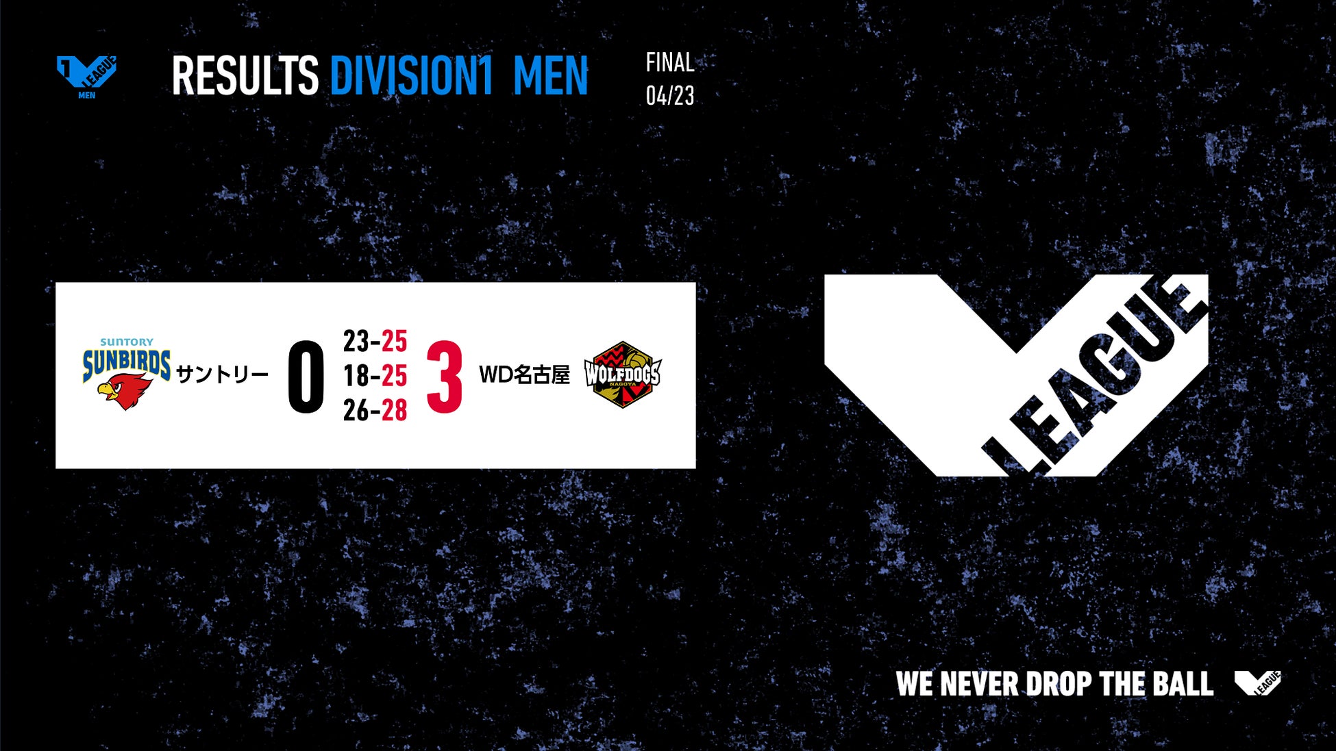 本日(4/23)、中央日本土地建物グループ presents 2022-23 V.LEAGUE DIVISION1 MEN V.FINAL STAGE FINALが国立代々木競技場第一体育館(東京都渋谷区)で行われ、ウルフドッグス名古屋がサントリーサンバーズに3-0(25-23,25-18,28-26)で勝利して、2022-23 V.LEAGUE DIVISION1 MENのチャンピオンとなりました。WD名古屋は7年ぶり2度目の優勝です。