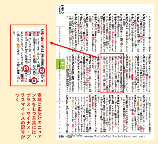 また、近年使われるようになった言葉や正反対のニュアンスを持つ言葉には、特別なラベルが付けられています。