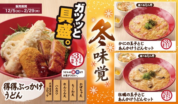 また、冬のあったかメニューも好評販売中で、甘みが強くジューシーな紅ズワイガニを使用した「かにの玉子とじあんかけうどん」と広島県産牡蠣を使用した「牡蠣の玉子とじあんかけうどん」がオススメです。