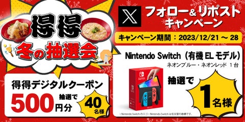 株式会社家族亭が運営するうどんチェーン「得得」は、2023年12月21日から28日までの期間、冬の抽選会Xフォロー&リポストキャンペーンを開催します。