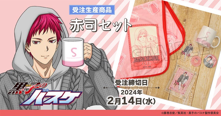 「黒子のバスケ」のTVアニメに登場するキャラクター、赤司征十郎の新商品が発売されます!今年のテーマは「ブレイクタイム」で、アクリルスタンド、缶バッジ、フォトフレーム、ブロマイド、ブランケット、マグカップの6点セットが登場します。