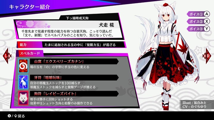 犬走椛は白狼天狗で、覚醒力玉と個性的なスペルカードを使用することができます。