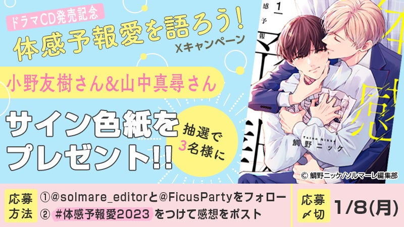 期間中にソルマーレ編集部とFicus Partyの公式アカウントをフォローし、「#体感予報愛2023」をつけて感想を投稿すると、抽選で3名にドラマCD出演声優のサイン色紙がプレゼントされます。