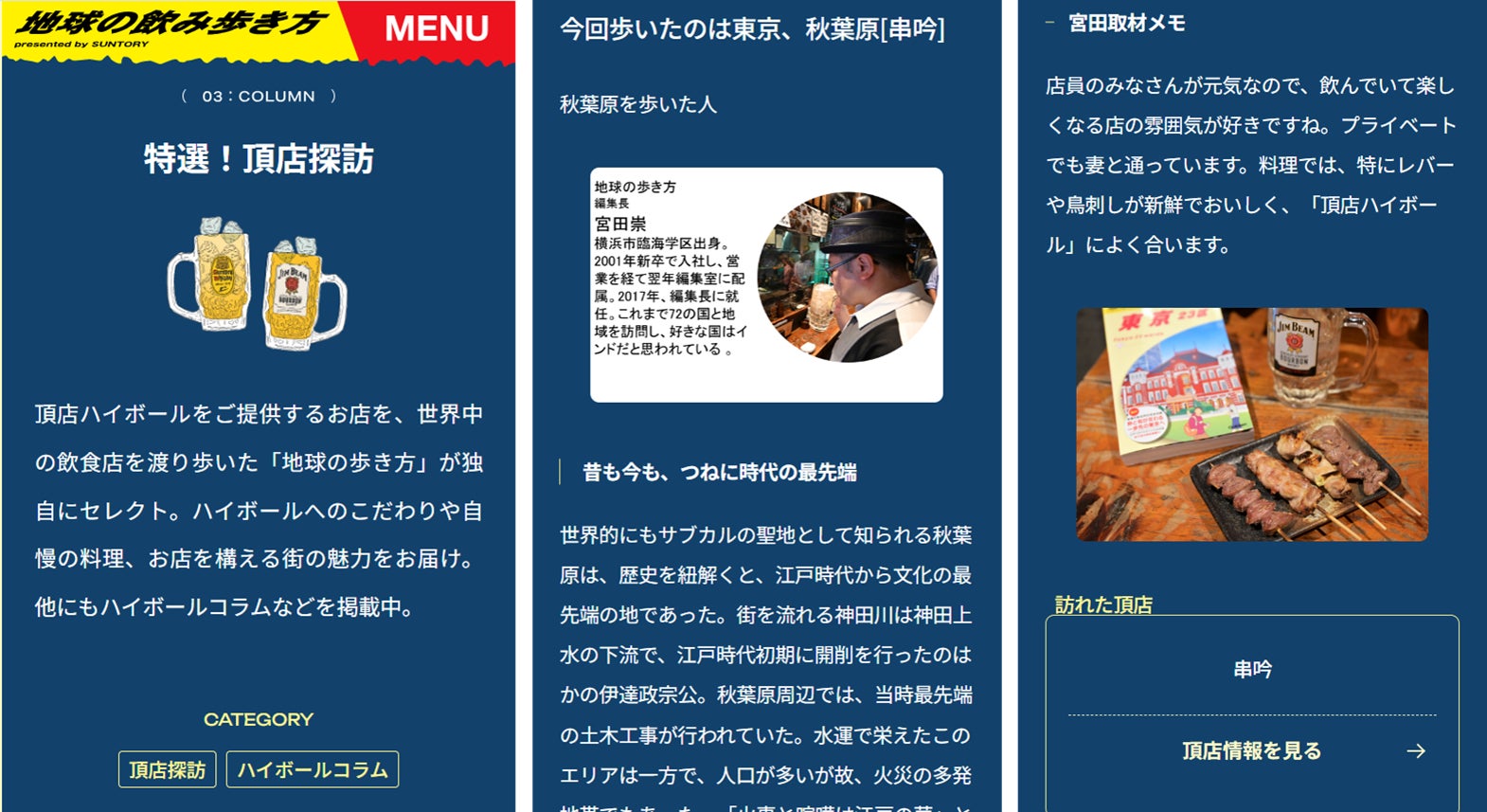 また、地球の歩き方特派員による現地レポートや頂店ハイボールの条件を世界各地の有名スポットになぞらえた記事など、読み応えのあるコラムも充実しています。