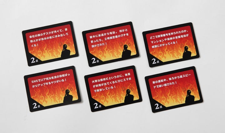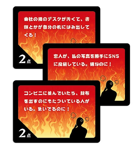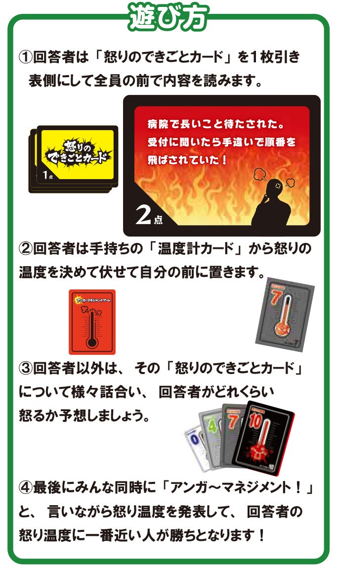 カードには怒りを感じる場面が書かれており、他のプレイヤーは回答者の怒りを予想します。