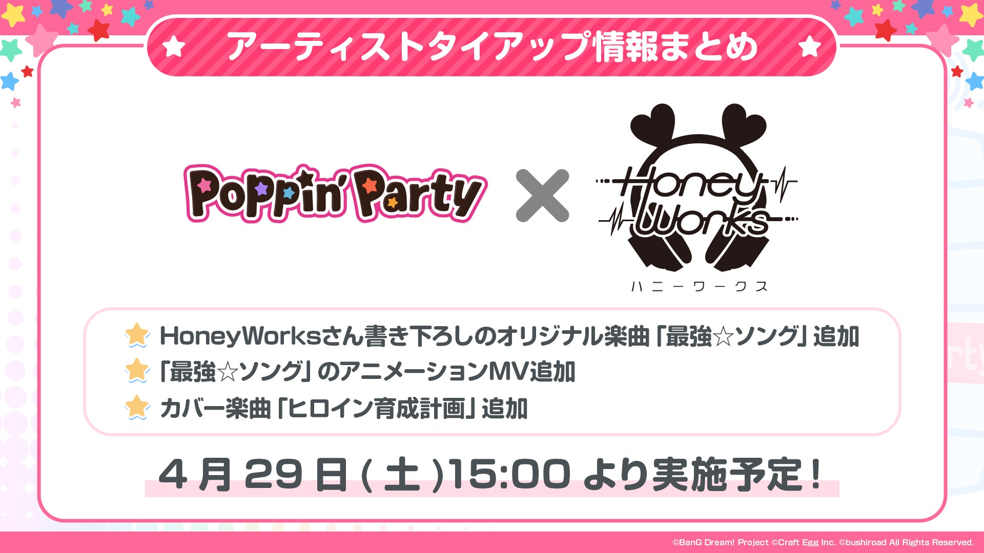 また、アーティストタイアップ「Poppin’Party×HoneyWorks」も実施され、HoneyWorksさんが書き下ろした楽曲『最強☆ソング』と、本楽曲のアニメーションMVが追加される。