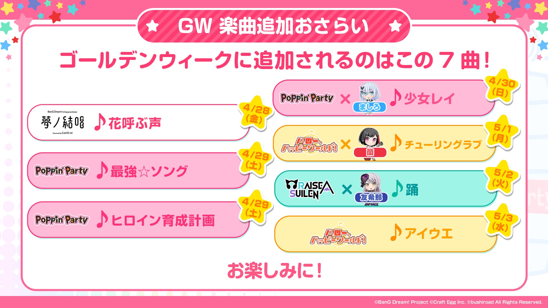 「バンドリ! ガールズバンドパーティ!」が、2023年のゴールデンウィーク期間中に最大70回無料ガチャや合計7曲の楽曲追加などのキャンペーンを開催することが発表された。