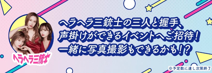 キャンペーン期間中に新規でLikemeカードに入会・発行すると、ヘラヘラ三銃士との握手や声掛けができるイベントへの招待や、抽選で当日のヘラヘラ三銃士と一緒に写真が撮れる権利がプレゼントされます。