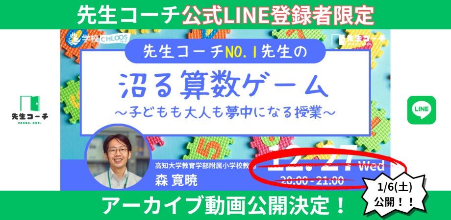 - 先生コーチ公式LINE登録者限定の「沼る算数ゲーム ~子どもも大人も夢中になる授業~」対談イベントのアーカイブ動画が公開されました。