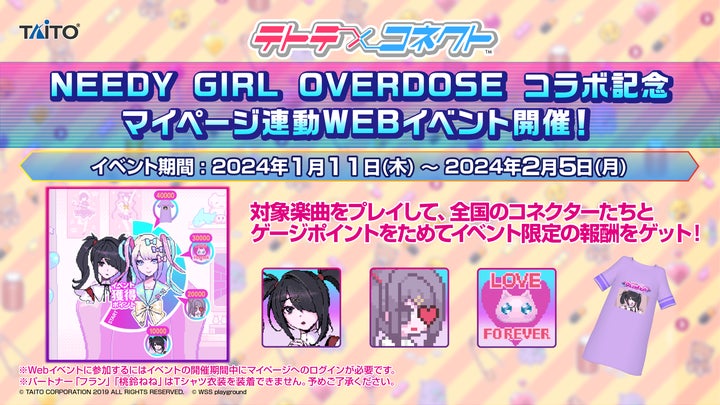 株式会社タイトーは、アーケードゲーム『テトテコネクト』と『NEEDY GIRL OVERDOSE』のコラボイベントを開催します。