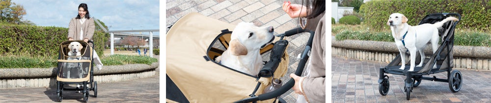 これまでの商品に加え、小型犬から大型犬まで対応できる5種類の折り畳みペットカートが登場します。