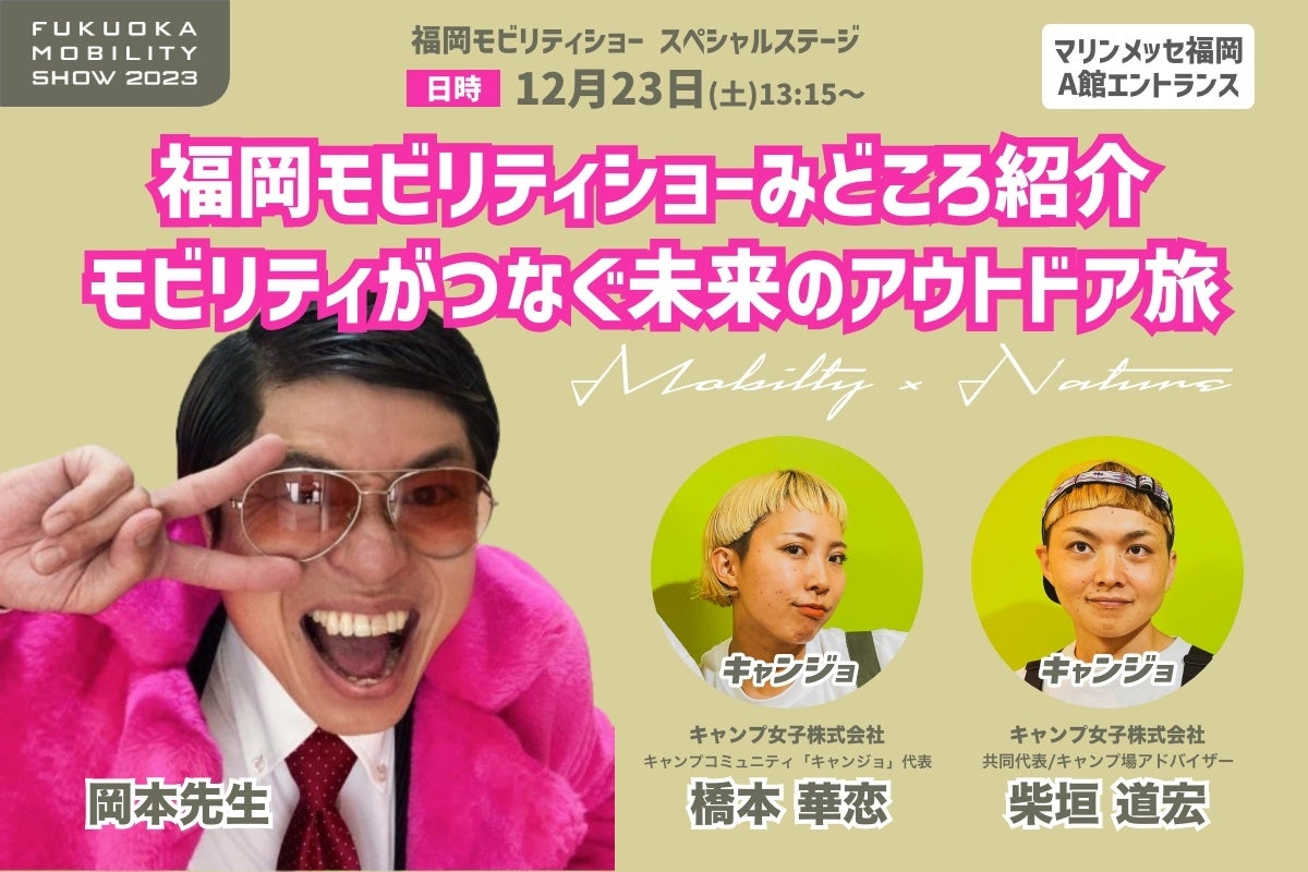 福岡モビリティショー2023では、車好きの岡本先生とキャンプ女子株式会社の橋本華恋と柴垣道宏がステージトークショーを行いました。
