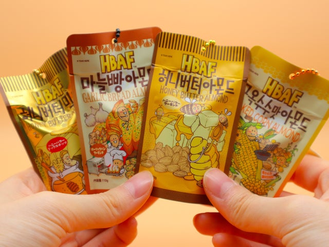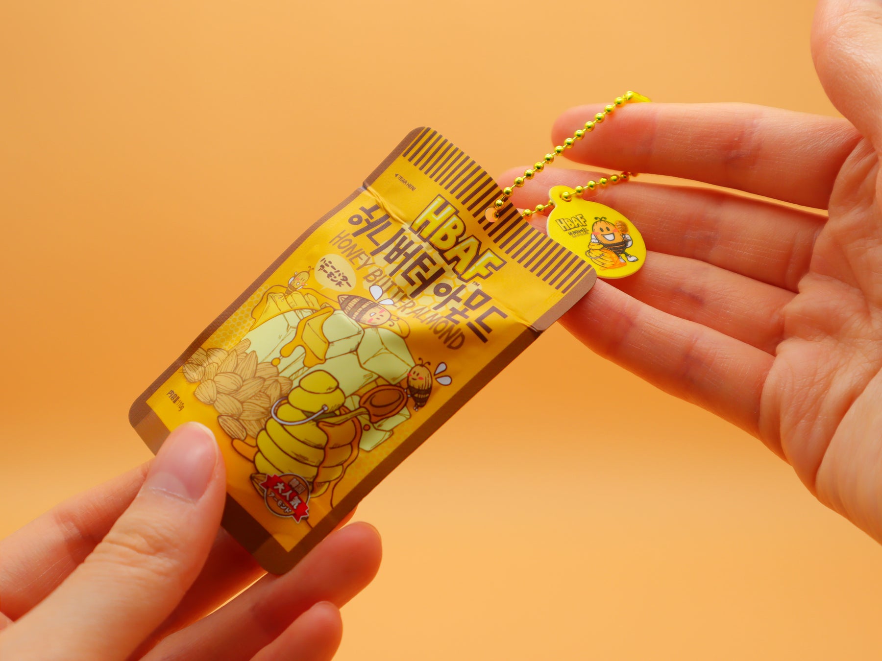 「HBAF(バフ)シャカシャカチャーム」は、韓国発の人気シーズニングアーモンド「HBAF」シリーズをミニチュアマスコットにした限定カプセルトイです。